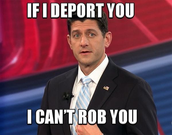 Paul Ryan did a talk thing last night where he told all the little children he wouldn't be deporting all their Messican parents with a jack-booted secret police force, but he IS going to take all your Obamacare away as soon as possible. He also said he didn't want to ban lobbyists because of cancer, and olds, and stuff.