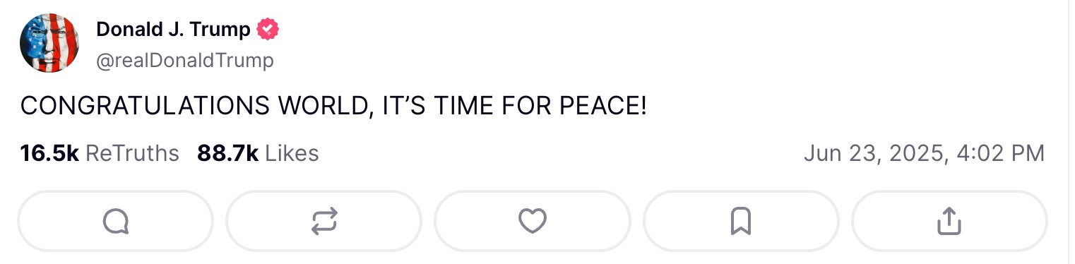 “CONGRATULATIONS TO EVERYONE! It has been fully agreed by and between Israel and Iran that there will be a Complete and Total CEASEFIRE (in approximately 6 hours from now, when Israel and Iran have wound down and completed their in progress, final missions!), for 12 hours, at which point the War will be considered, ENDED!”