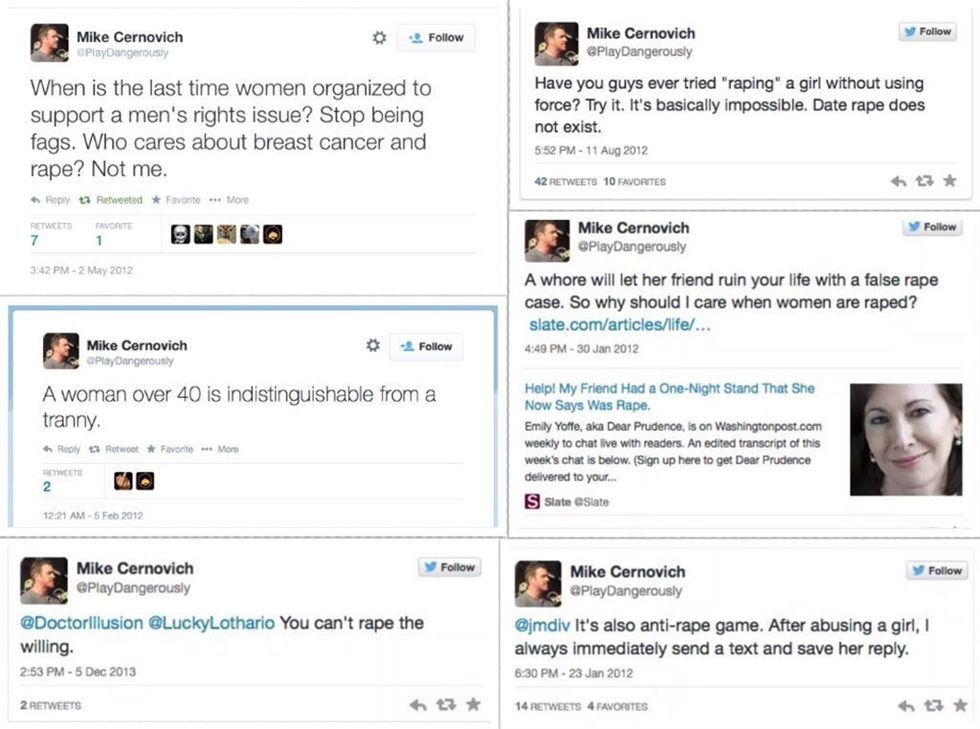 For Cernovich, this likely goes further. As you may know, he was previously charged with rape and got the charges reduced after intimidating a witness into changing their testimony -- and claims he was "falsely accused." He wrote a list of tips to avoid false rape accusations, which included taping sexual encounters without the consent of the woman involved. So not only does he believe that liberals go around falsely accusing people of racism, he also believes that women go around falsely accusing men of rape. You know, for fun.