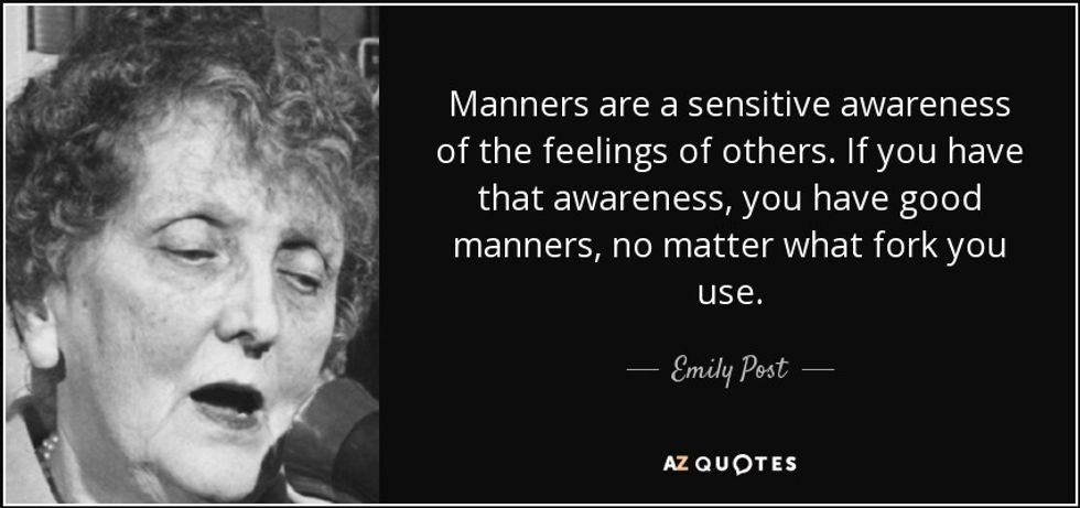 Guillotines aside, perhaps Peggy Noonan might do well to consider the reasoning behind why it is considered rude to chew with one's mouth open. It's not just an arbitrary rule, meant to make things less convenient for people who find it more comfortable to do so, it is a rude thing to do because it grosses other people out and makes them uncomfortable. The entire point of etiquette, in fact, is going just a little bit out of our own way in order to make other people comfortable.