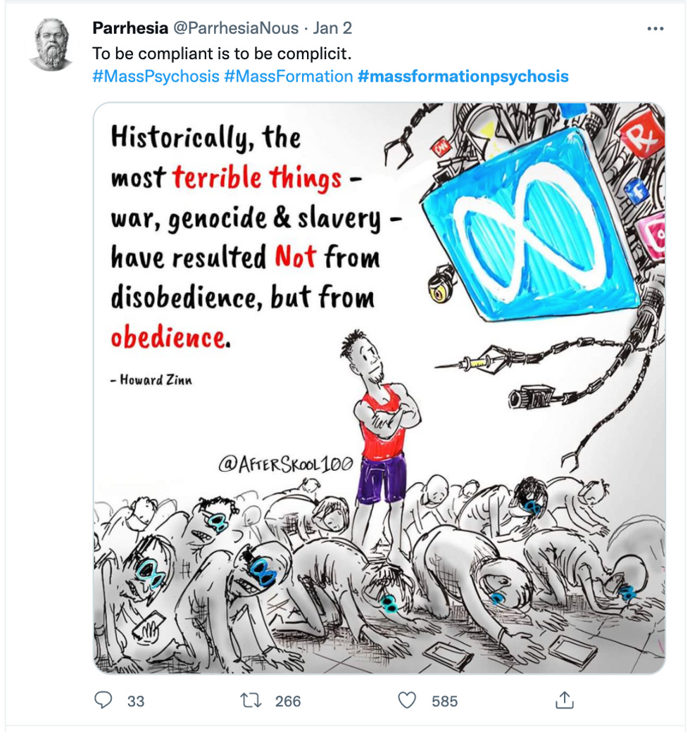 According to Malone, the condition occurs when a society “becomes decoupled from each other and has a free-floating anxiety in a sense that things don’t make sense… And then their attention gets focused by a leader or series of events on one small point, just like hypnosis.”