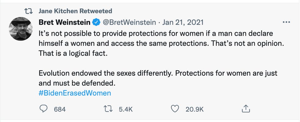 First of all, the only non-anti-vaccine political stance she appears to have ever taken on her Twitter is a retweet of an extremely transphobic tweet from Bret Weinstein. One would imagine that such a dedicated liberal might have like, one opinion there that could conceivably be described as liberal. But no.