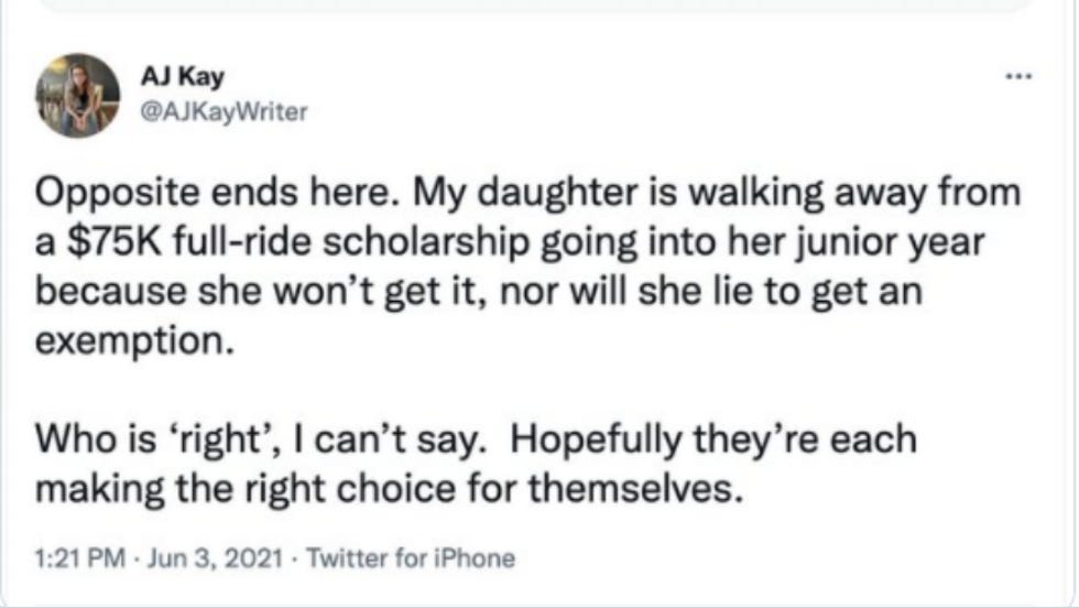 Kitchen's mother told the same story in June, clearly stating, "My daughter is walking away from a $75K full-ride scholarship going into her junior year because she won’t get it, nor will she lie to get an exemption."