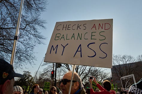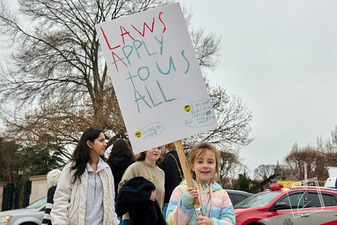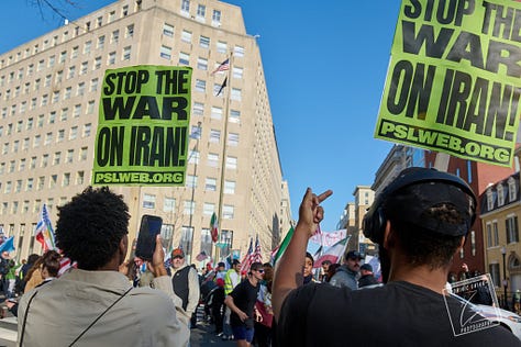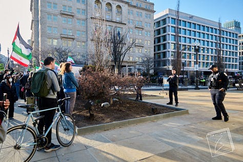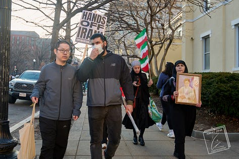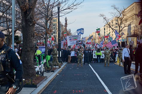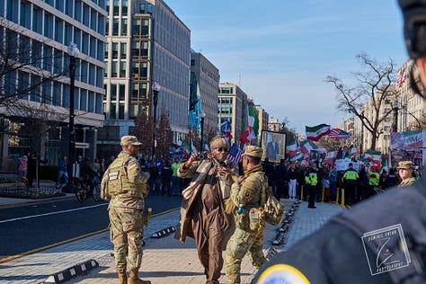 Over on H Street, in front of a now-entirely fenced off Lafayette Park, was a group of protesters who were against the bombings in Iran. And Gaza. And Lebanon. And Syria. And everywhere else the US/Israeli war machine has spent the last year either ignoring the cries of Arab people, and/or relentlessly dropping explosives on civilians (presumably as a pretext for luxury beachfront Trump hotels).