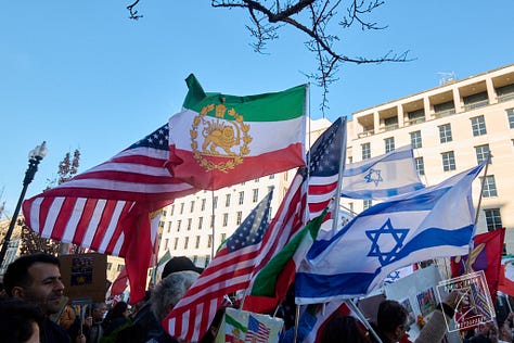 At the other end of the block, on I Street, was a group of people blaring the Village People’s “Y.M.C.A.” They waved Israeli flags, and US flags, a Taiwanese flag, a Kurdish flag, and the flag of the old Iranian Republic. One man carried an effigy of the late Ayatollah Ali Khamenei - a skeletal hand reaching out from a black robe on a wooden plank. Another bounced a sun-bleached cardboard cutout of Donald Trump. One woman carried a sign thanking Israeli Prime Minister Benjamin Netanyahu and Trump. Others carried pictures of Reza Pahlavi, the son of the late shah, who fancies himself Iran’s latest dynasty warrior.