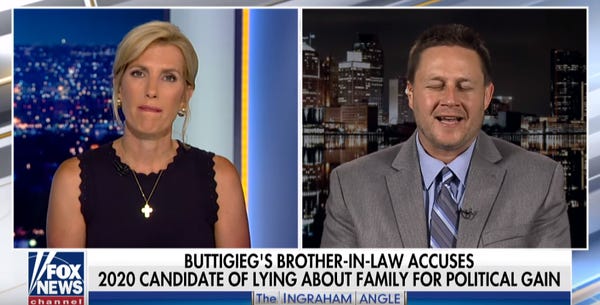 And we really don't feel bad now, because on Friday night, as we were hightailing it out of here for the weekend, Rhyan Glezman -- who says his family never rejected Chasten, and that this is just a story Pete Buttigieg made up because Pete Buttigieg is also a lying gay liar who lies -- decided to go park his ass on Laura Ingraham's Fox News white supremacist dickhead TV show. You know, the place where the host lady says Trump's baby jails for babies are just like "summer camp."