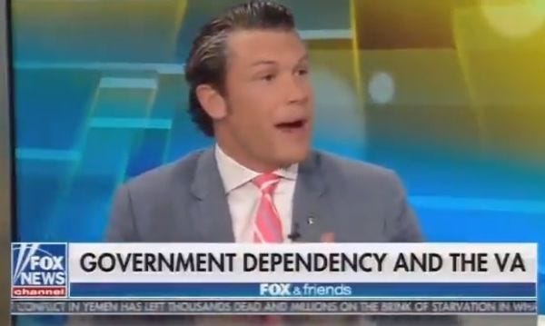 "Fox & Friends" idiot host (but we repeat ourselves) Pete Hegseth, who has long advocated for privatizing the Veterans Affairs healthcare system, stepped in his own pro-privatization bullshit Friday when he suggested that veterans who actually use the benefits they're entitled to are lazy takers who have become "dependent" on government. Cohost Brian Kilmeade chimed in, agreeing vets should have more "personal integrity." Fortunately, Hegseth and rightwingers later agreed he'd actually said nothing of the sort, because he'd started the clip calling for privatizing the VA, or as these assholes like to claim, letting vets have more "choice" in their healthcare (by privatizing the VA). Remember, Trump wanted Hegseth to be VA secretary, kids!