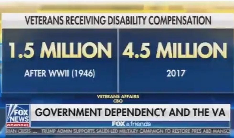 Hegseth explained that providing VA hospital care for vets is actually tyranny since it doesn't "compel" veterans to find their own local doctors outside the VA system. Then cohost Ainsley Earhardt offered staggering proof that the VA is just overrun with people using too many services -- unlike in the good old days right after World War II, when hardly any vets were clogging up the system with their fakey-fake disability claims (yes, we are adding the subtext) there: