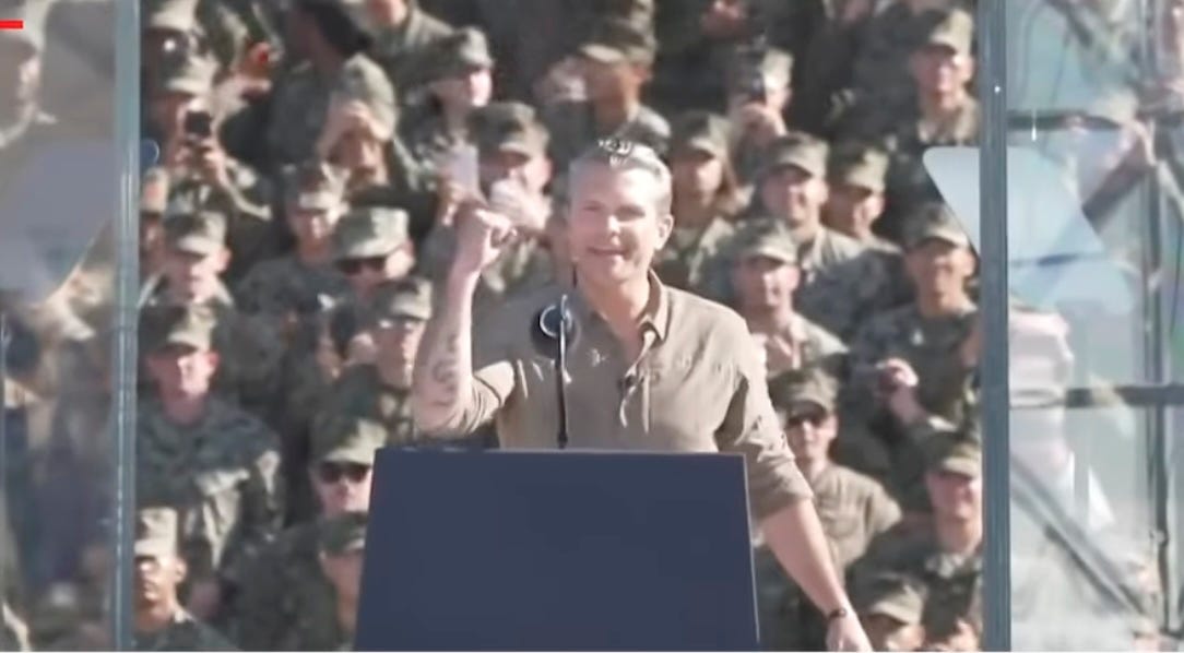 Later at a rah-rah event for the soldiers, Hegseth, looking greyish, lectured them about how diversity is bad, and how great it is that they get to “kill bad guys and break things for a living.” Then he made them OO-RAH on command.