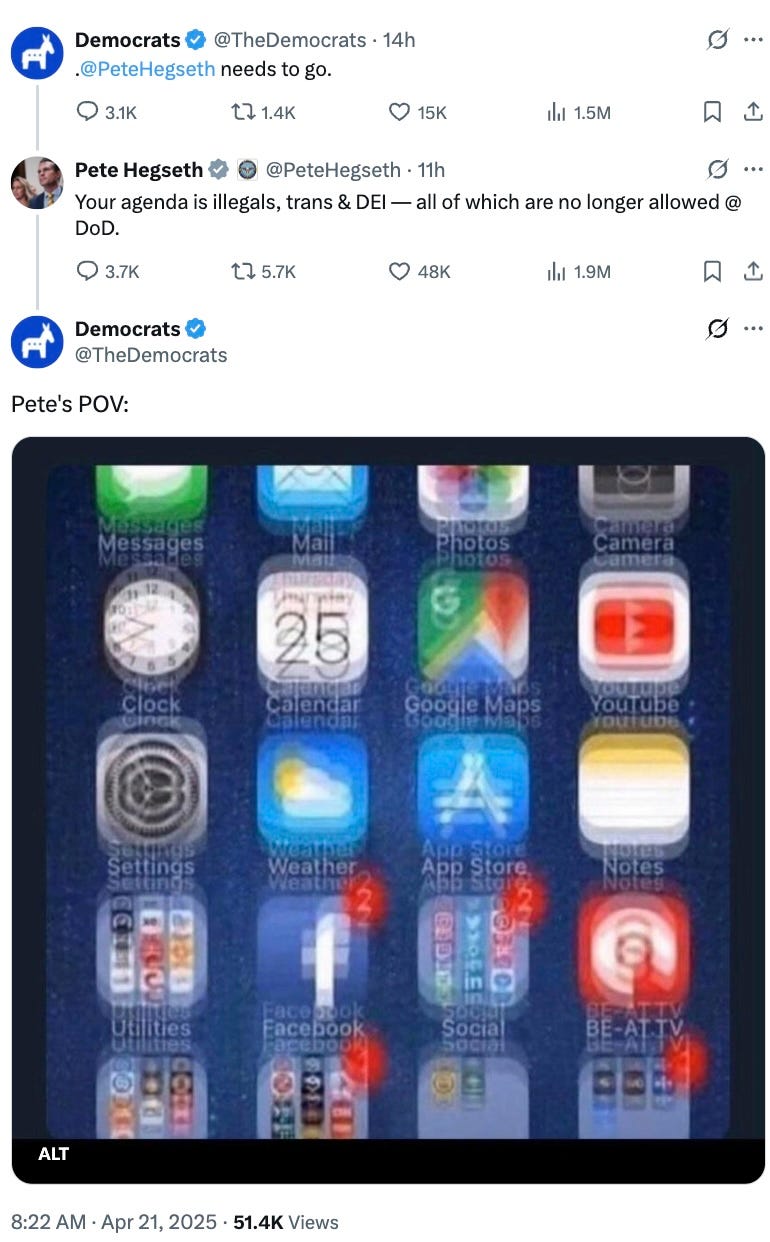 Hey, you know who DIDN’T leak war plans on Signal to their wife, an Atlantic editor and a golden retriever? All of those military lawyers, Secretary of Defense Lloyd Austin, or any of the other “DEI” people that Hegseth fired. Just saying.