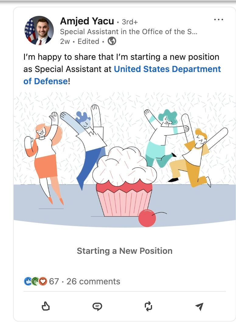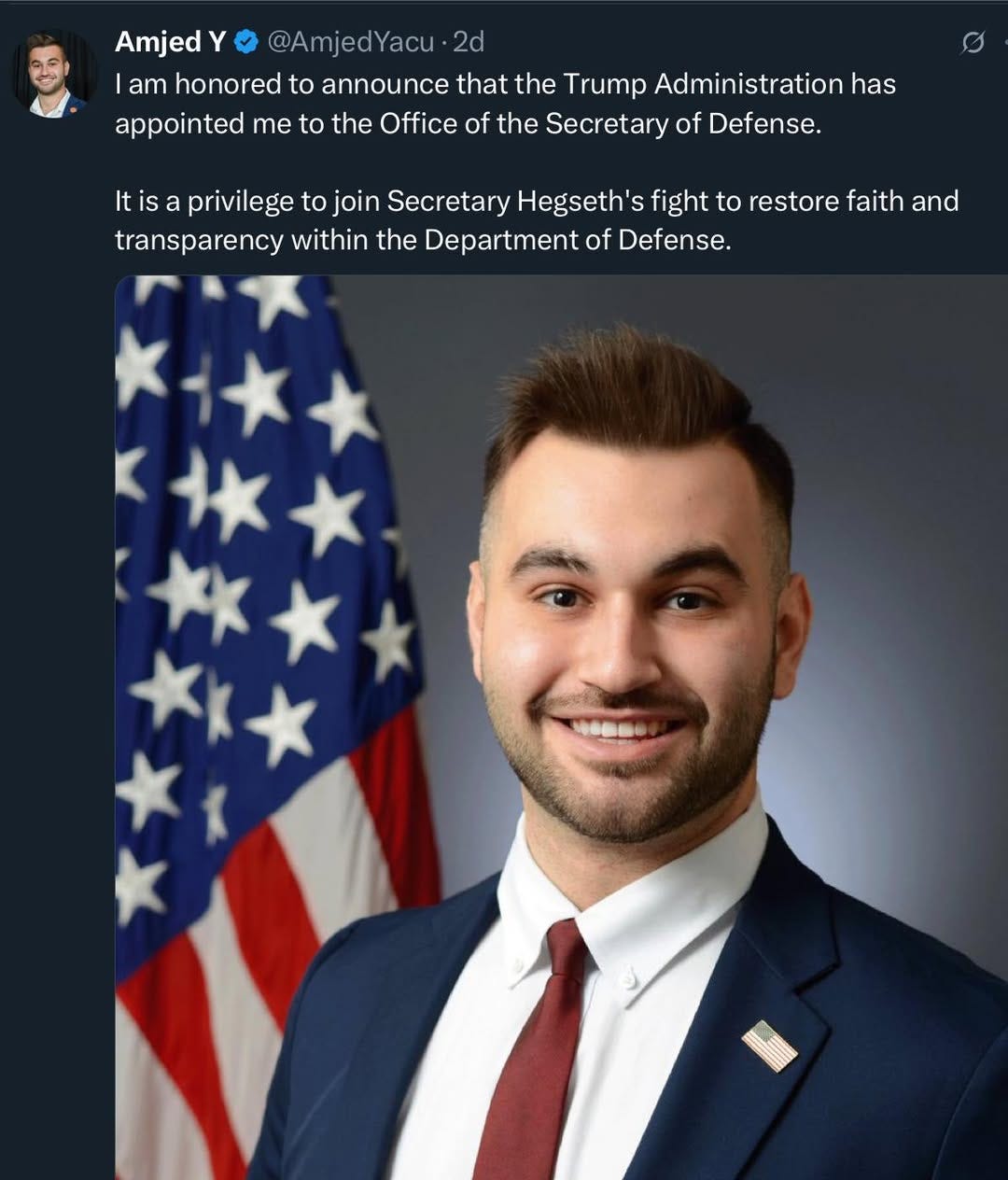 But never mind all that purging and quitting, Hegseth has new help now! According to their social medias there’s two new kids in his office: 23-year-old Royce Chamberlin, and 2024 Clemson financial management grad Amjed Yacu, who went from interning to the SecDef’s office in four months, a meteoric rise! Yacu was so thrilled he celebrated his hiring with one of those LinkedIn gifs of people dancing around a giant cupcake, and Chamberlin cooed on Facebook: “I am excited and honored to announce I have been appointed to the Office of the Secretary of Defense at the DoD. Helping ensure our country is viewed as a force not to be reckoned with. ”