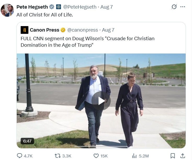 Then before we could even finish absorbing that atrocity, Hegseth raised a few eyebrows by posting to Twitter an interview CNN’s Pamela Brown did with Doug Wilson, the head of Christ Church, an Idaho-based church and the base of a denomination called the Communion of Reformed Evangelical Churches (CREC), which just opened a new branch in Washington DC. Pete Hegseth and his family are some of its more famous parishioners, and in a CREC church near Nashville, where Hegseth lives.