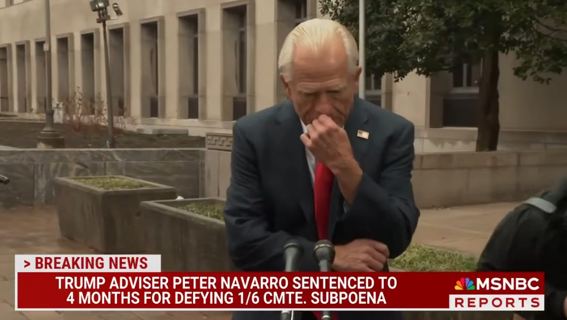 Peter Navarro, the Trump econ wackjob who is also a conspiracy theory wackjob and January 6 wackjob, was sentenced to prison for four months today for defying a subpoena from the House January 6 Select Committee. He also has to pay $9,500 in fines, for ignoring the subpoenas for a deposition and documents.