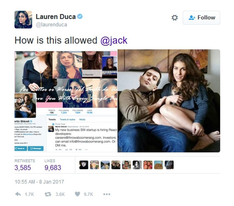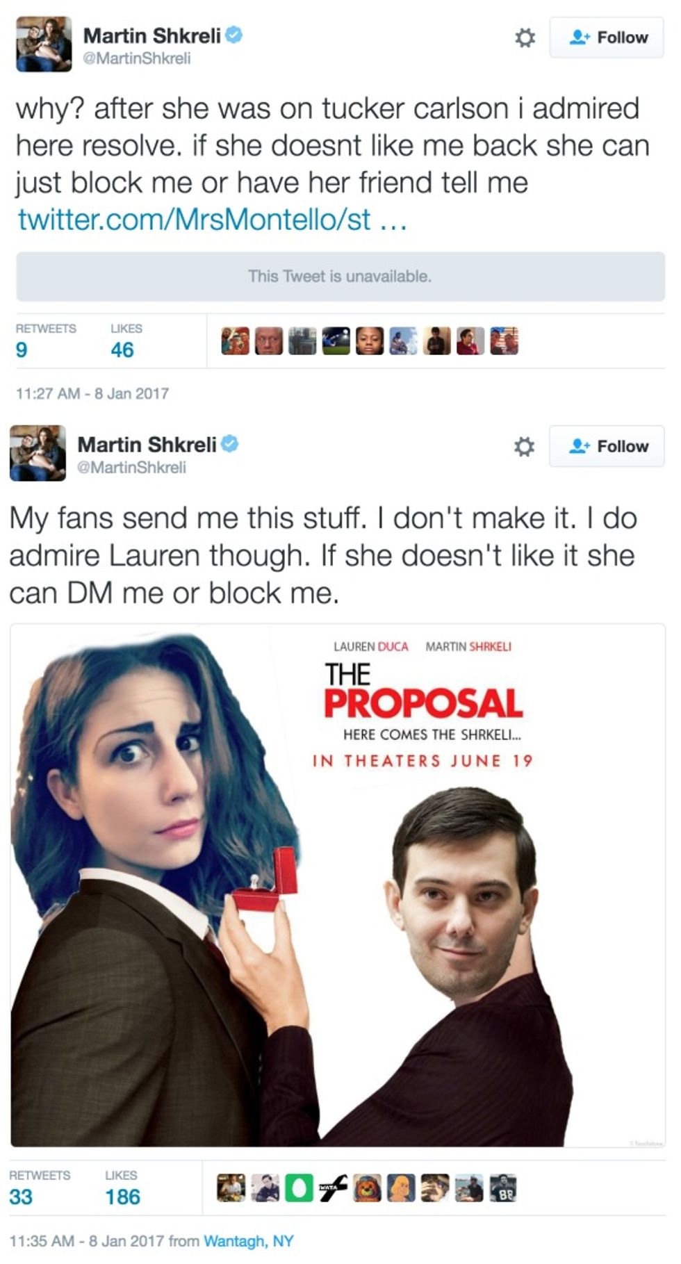 Duca told BuzzFeed Sunday that Shkreli, whom she's never met, has been Tweeting at her and pretending to ask her to date him, which is not exactly likely given that A) she is married and B) he is a loathsome gunny sack full of decaying hyena innards.