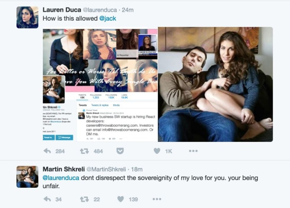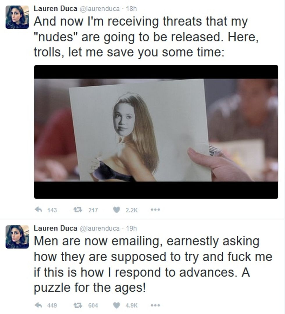 Ms. Duca got all hysterical, as women on the internet sometimes do when men are good-naturedly telling them how fuckable they are, because they don't even belong on the internet, ha-ha, and Tweeted the images to Twitter CEO Jack Dorsey, saying the photo made her feel sick: