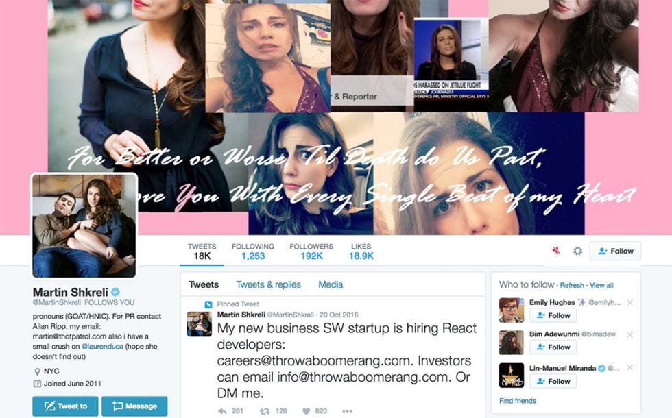 Martin Shkreli, the alleged human being who became famous in 2015 for raising the price of a vital AIDS drug by 5000% and has refused to go away, ever, got himself kicked off the Twitter machine this weekend, and now all the Trumpkins and Tweeter misogynists are sad. After all, Shkreli was merely harassing Lauren Duca, the Teen Vogue writer who wrote a fine essay on Donald Trump as a gaslighting serial liar and who also kicked Tucker Carlson's ass, with her words, on his own teevee show, so really, it was her fault that Shkreli and the Online Howler Monkey Brigade had to harass her for being a woman on the internet.