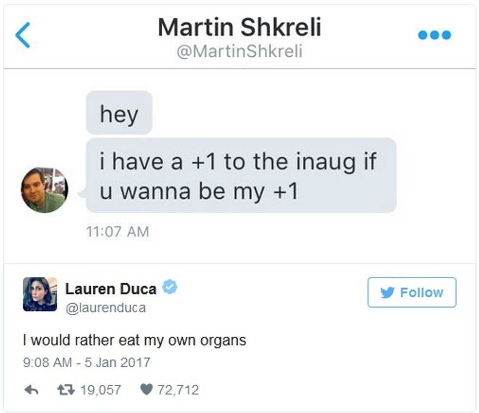 On Thursday of last week, Duca tweeted a screenshot of Shkreli's amusing and whimsical direct-message "offer" to take her with him to the Trump inauguration, and she replied with something less than enthusiasm: