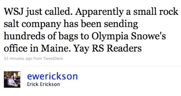 Looking forward to this WSJ article, based on this epic thing. Can you imagine how many votes Olympia Snowe will win for life if her staffers go neighborhood to neighborhood giving each household a bag of rock salt for the winter? [ Twitter ]