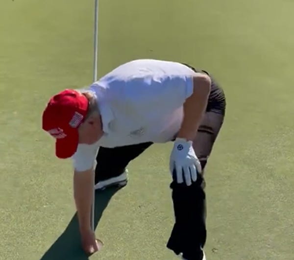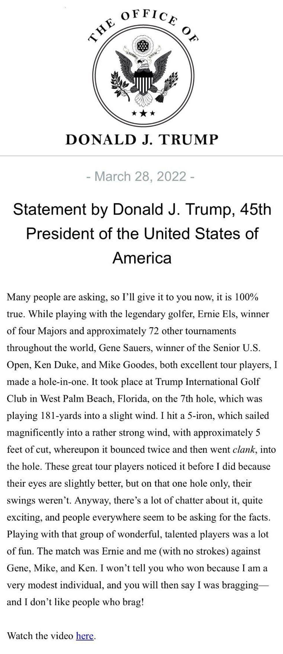 As you can see at the bottom, it says there is a video attached. Is it a video of Trump making a hole in one? No, it is not. It is a video from one of Trump's comms idiots, of him waddling toward the hole and getting the ball out.