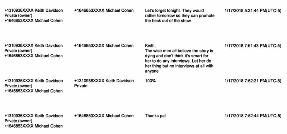 When last we left the crime scene, Avenatti had just filed suit against Cohen and Davidson, alleging that they conspired against Davidson's former client Stormy Daniels. And he had the texts to prove it!