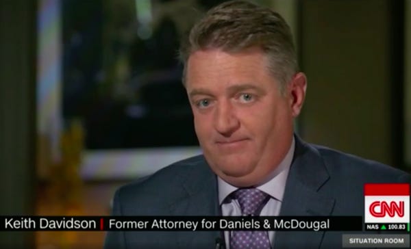 But Davidson is nothing if not ballsy. He's also suing Michael Cohen for secretly recording their phone conversations in violation of California law. Yes, a lawyer who makes his living selling surreptitiously recorded sex tapes has been grievously injured because Michael Cohen violated his privacy. We anticipate Davidson's imminent arrest for MURDERING IRONY DEAD.