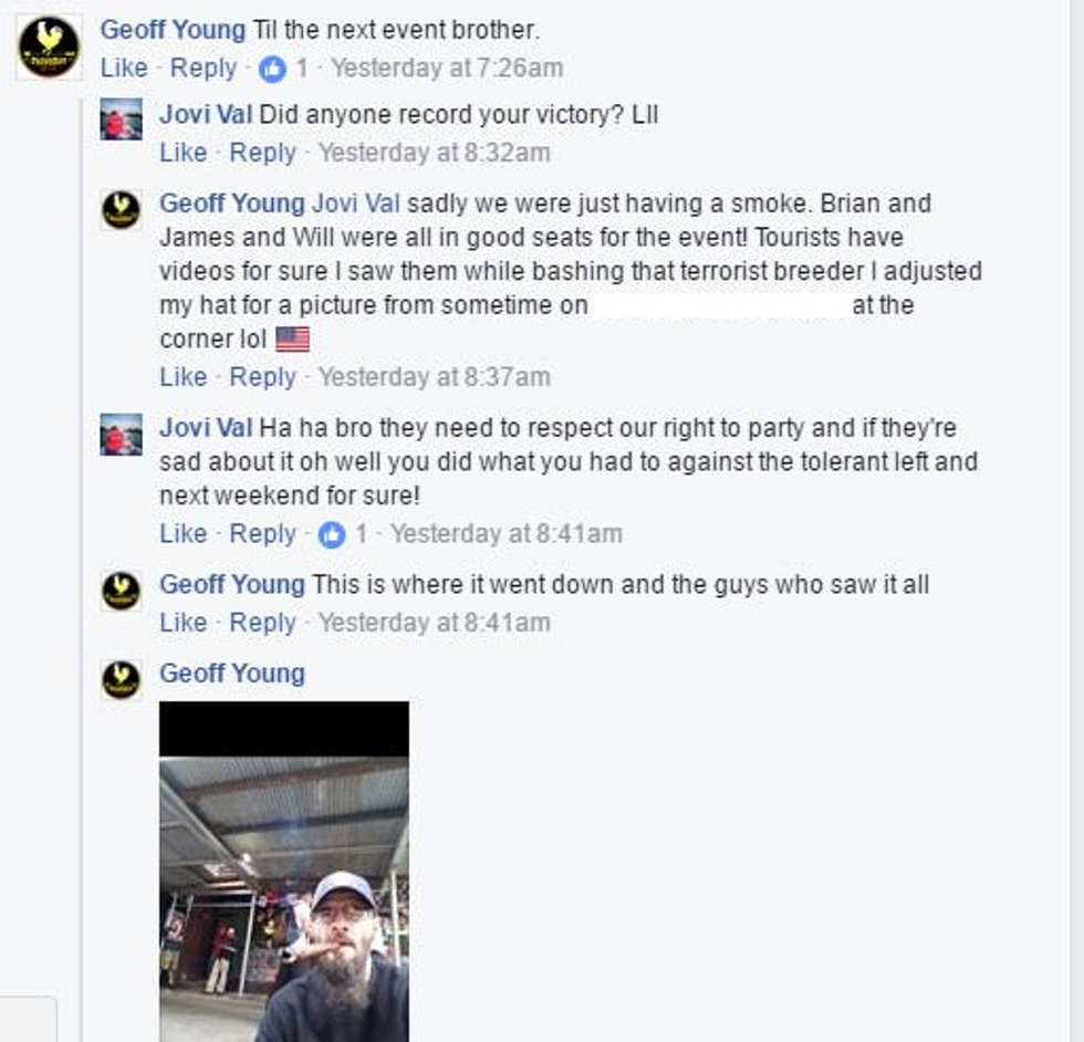"Tourists have videos for sure I saw them while bashing that terrorist breeder I adjusted my hat for a picture [ sic, sic, sic ]," Young wrote in conversation with fellow Proud Boy Jovi Val -- a friend of noted white supremacist Jason Kessler and one of the few people to show up to this year's Unite The Right rally.