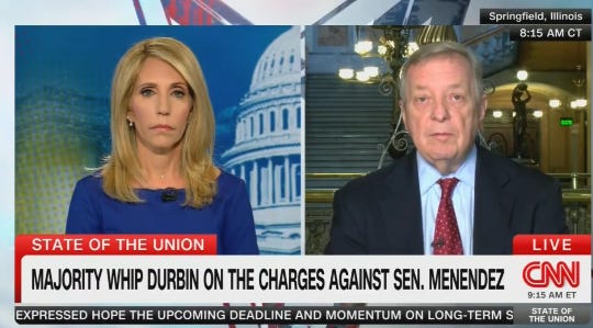 Many Democratic lawmakers in the House, Senate, and Menendez’s home state have called for his resignation in light of the announcement of a federal corruption investigation. But Senate Majority Whip Dick Durbin demonstrated his trademark “bravery” on CNN’s “State Of The Union.”