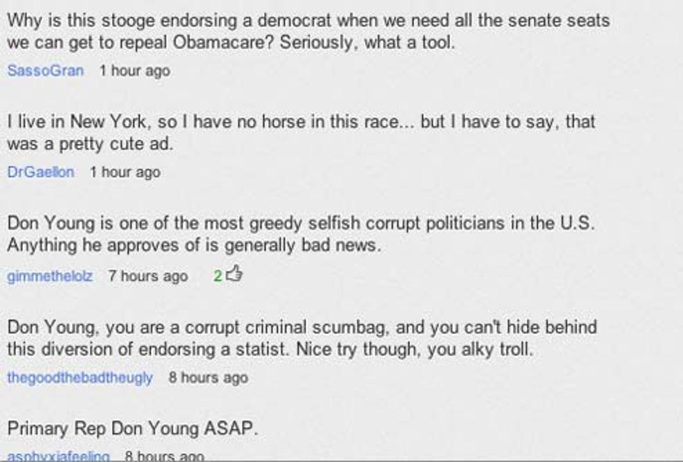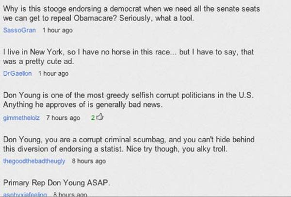 Isn't it cute how Alaska Republican Don Young literally spends the entire ad begging to be allowed to call Nancy Pelosi a rude name? WONKETTE GUESSING GAME: Does this name start with "b" or "c"? You be the judge! The Washington Post "She The People" politics ladyblog calls it " refreshing ," so we know it's all in fun.