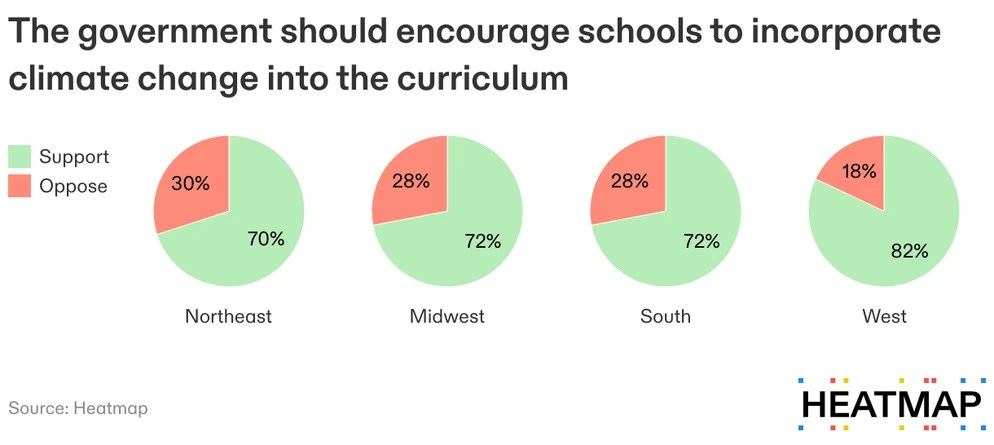 That Heatmap poll also found that three-quarters of Americans (fine, 74 percent) favor government policies to encourage schools to teach about climate change, and that includes more than half of Republicans and independents, too — 59 percent and 75 percent, respectively. And here’s a pretty encouraging result as well: That large majority didn’t vary much by region either: