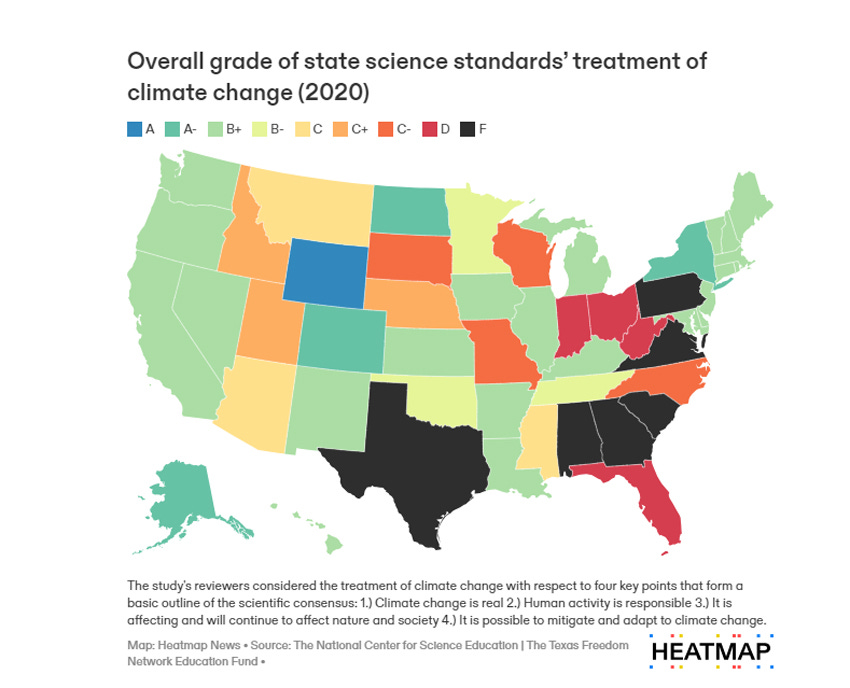 On the whole, the state of climate education is kinda poopy, according to a 2020 study by the National Center for Science Education and the Texas Freedom Network Education Fund, which graded states on whether their science standards covered four key ideas: