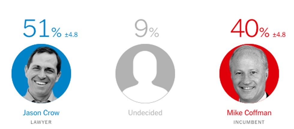 Even Paul Ryan's beneficence has limits, though. (And his vapidity, allegedly.) Last week, CLF cut off CO-6's Mike Coffman, another four-term incumbent in a district won by Clinton in 2016. How bad was Coffman's internal polling that it sent CLF running for the hills? Strangely, the campaign kept that info to themselves. But the NYT/Sienna poll has Coffman trailing lawyer and former Army Ranger Jason Crow by 11 points, and the Democratic House Majority PAC was confident enough to cancel $700,000 of ad buys for Crow.