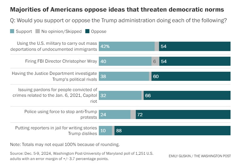 According to a new Washington Post-University of Maryland poll, Americans mostly don’t want Donald Trump to do most of the cruel and democracy-crushing things he promised he’ll do (Washington Post gift link). Most Republicans, however, definitely share several of Trump’s wettest dreams, especially the ones about using the military to deport everyone who’s in the country without papers, and also the ones about going after his enemies and pardoning the poor oppressed January 6 Capitol visitors. But the poll’s results for Republicans are way out of line for Americans as a whole.