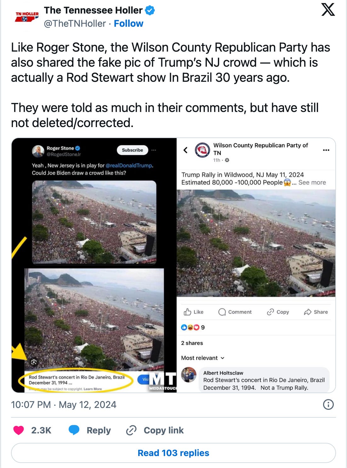 Donald Trump has been saying for days that 100,000 people came to see him in Wildwood, New Jersey, but as is usually the case when Trump is talking about the sizes of things, he’s lying. Marjorie Taylor Greene spread the lie, because she’s stupid. It got so pathetic that Roger Stone and other MAGA lie-idiots were sharing pictures of a Rod Stewart concert in Brazil and claiming that was the Trump rally. (New Jersey is famous for its coastal mountains, just like Rio.)