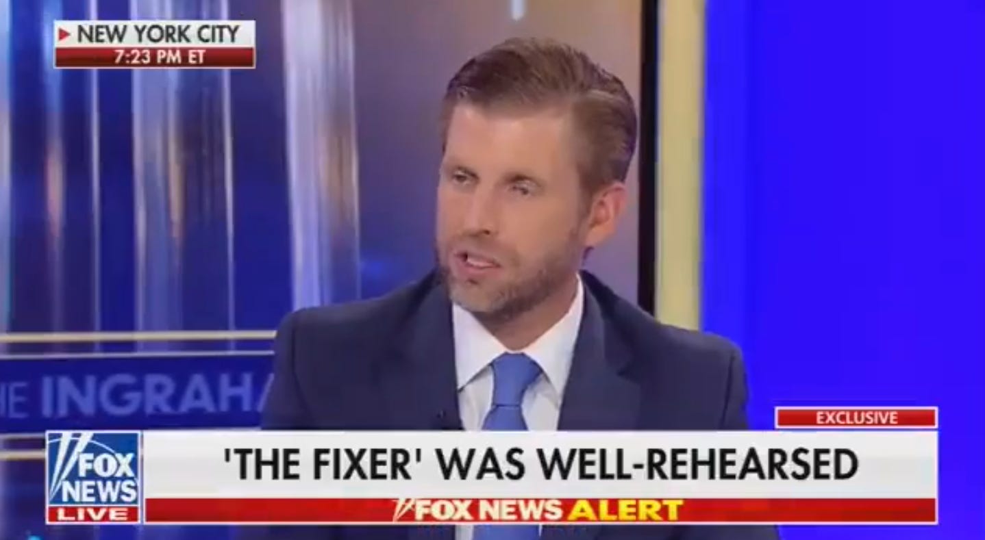 Eric was on the Laura Ingraham program last night when he said these idiot things comparing his dad’s rally to Bruce Springsteen concerts. We guess it was Ingraham’s turn to babysit. Mediaite captured the full babble: