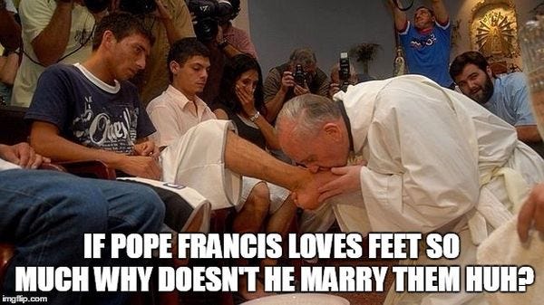 Unless he really just does it because he really does have a foot fetish and thank Mother Mary he's wearing that big robe because we do not want to see Pope Nice-Nice's Bone-Bone right now, thank you very much.