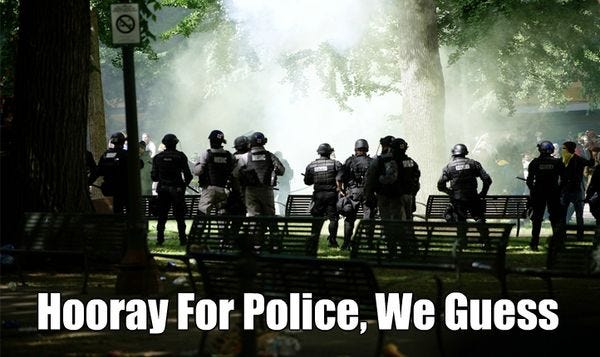 Police wearing riot gear did clear antifascist and black bloc demonstrators from nearby Chapman and Lownsdale squares, using flash-bang grenades, tear gas, and pepper balls to disperse the antifa folks after "masked protesters threw bloody tampons into police ranks while chanting, 'All cops are bastards.'" Yeah, nice folks. Police arrested either 14 people (said the Oregonian ) or 4 people ( Willamette Week ), and temporarily detained about 200 people by "kettling" them within a cordon of cops.