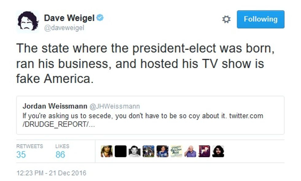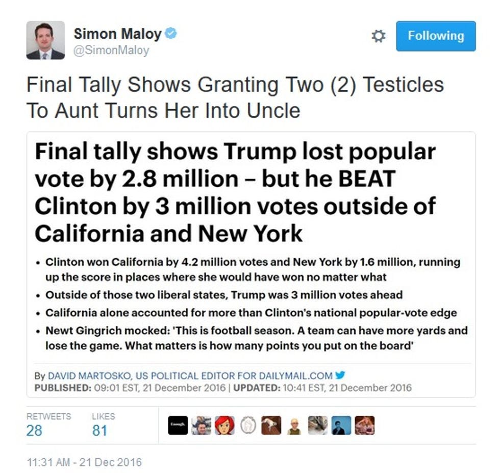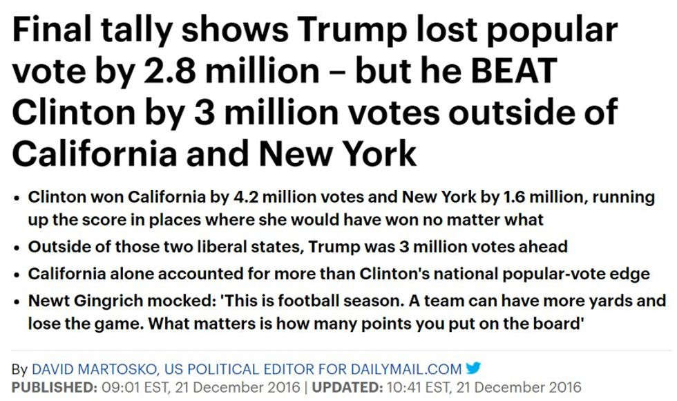 As everyone knows, the only people who still think Hillary Clinton got more popular votes than Donald Trump are people who merely count the total of popular votes. If you use that biased method, it looks deceptively like Hillary Clinton got 2.8 million more votes nationwide than Donald Trump did, although Donald Trump definitely won the electoral vote by a landslide, as long as you believe that having the 46th-biggest electoral victory out of 58 presidential elections is a "landslide." It's still in the top fifty, and there are 50 states, and so if you subtract the popular vote totals from just two of those states, you find Trump actually won the popular votes by 3 million votes, according to the Daily Mail's David Martosko (who was cribbing from a theory popularized by -- LOL -- Joe Walsh ):