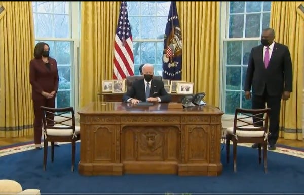Biden signed the executive order with Madam Vice President In Charge Kamala Harris on his right and freshly confirmed Defense Secretary Lloyd Austin on his left. The next four years are gonna be lit!