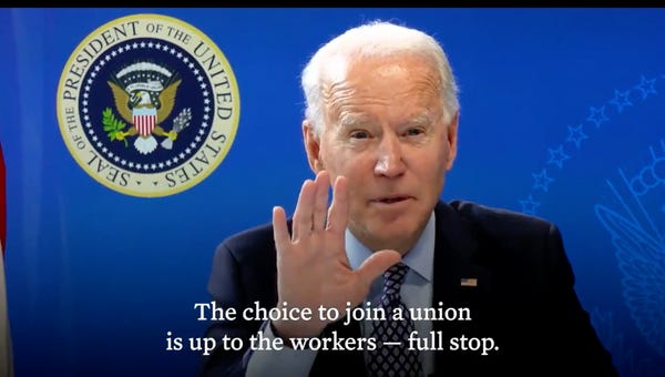 This is one of the most unambiguously pro-union statements from a sitting US president in recent memory. I appreciate how Biden paints an inclusive picture of union membership: It's not just working-class white guys with a metal lunchpail. Unions also protect the rights of women and workers of color (although they didn't always).