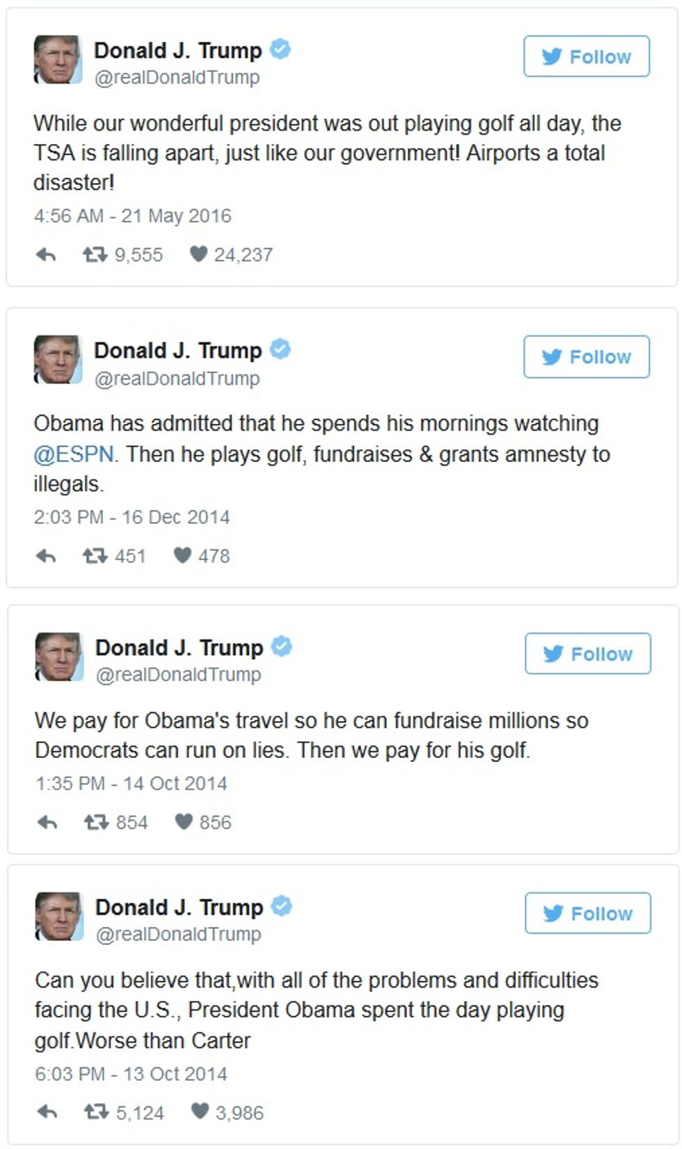 Damn you, Barack Obama. Without Obama for comparison, we'd be left trying to compare Trump's golf outings to Eisenhower's, which wouldn't even be interesting since Ike didn't even have a Twitter account.
