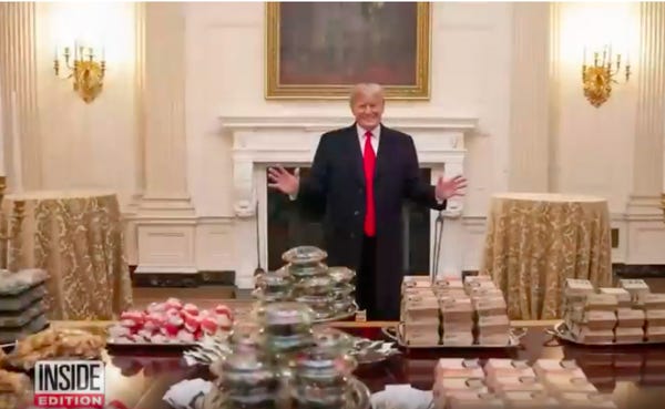 Jesus, it's like Birth of a Nation is playing non-stop at the racist bijou in Trump's head: "Obama did nothing but eat fried chicken while putting his stinky bare feet up on the furniture." Trump's racist fantasy simultaneously argues that Obama was so shiftless he just sat around watching ESPN for eight years but was content with a tiny 13-inch Sony with fuzzy rabbit ears reception. Trump had to go bigger, of course, so he could appreciate Sean Hannity in his full HD glory. (In case you really needed to know, an Obama White House official has declared Trump's bigoted claims total bullshit.)