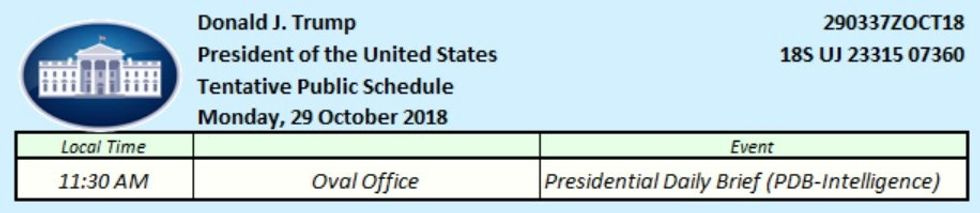 President Lazyass has a packed schedule today! First up, three hours on the curvy couch with Brian, Ainsley and Steve. Once the old bowels kick in, it's time to tweet some shit about the Lügenpresse and scream at Democrats for ruining civility. Plus a little shoutout to whichever GOP candidate kissed his orange ass hardest that morning -- so you better not embarrass him by losing, Ron! Then it's time for the "intelligence briefing," when John Kelly makes some words at him about wars, or economics or whatever, and leaves a pile of papers on the desk for Jared to read. It's exhausting!