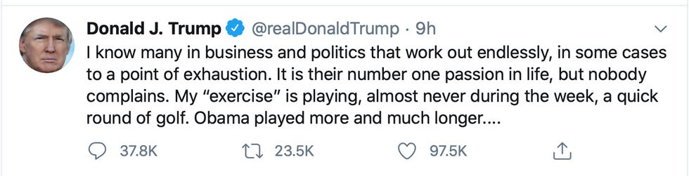 These obsessed Crossfitters, who I'm sure exist, aren't literally the president, but whatever. Trump claims his “exercise" is golf, because “exercise" is something you do once a week and very quickly. Melania Trump would call that a contractual obligation. (Allegedly!) He probably doesn't even believe his own nonsense, because he needlessly puts “exercise" in quotes like Dr. Evil's “laser." (Also doesn't understand how quotation marks work.)