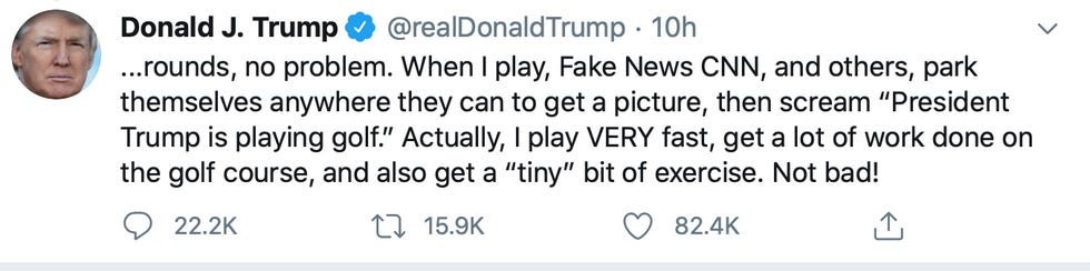 Trump's been criticized for golfing while the nation burns, although our position is that Trump should transition to a golf-only presidency. Trump took to the Twitter-mobile Sunday to explain why his old rich asshole pastime is essential work.