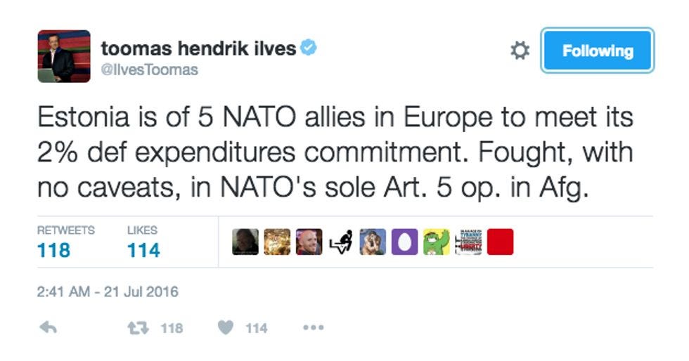 The president of Estonia hopped on the Twitter last night to pwn Trump about that: