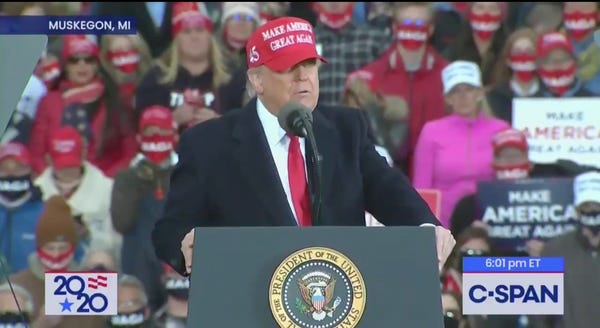 Trump also defied public health guidelines before thousands of supporters in Muskegon, Michigan on Saturday. Still eager to court that suburban lady vote, he viciously attacked Governor Gretchen Whitmer, who rightwing dirtbags plotted to abduct and possibly murder. The so-called “law and order" president has repeated the terrorists' accusations and demands: He's claimed Whitmer wants to be a “dictator" and that she should "open up the state," even thoughCOVID-19 cases there are surging.