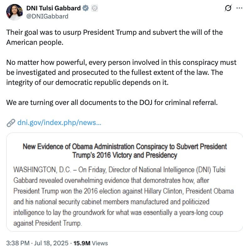 She’s back, the Director of National Intelligence/Russia’s girlfriend, who was banished to the land of wind and ghosts after she didn’t support Trump’s failed attempt to bomb Iranian nuclear facilities, about a dozen scandals ago. Sunday she went on Fox and X playing a familiar tune for any followers who haven’t gotten back in line yet, to remind them why they fell in love with Trump in the first place. It’s OBAMA WIRE TAPPS! Look at her lying to everybody’s face! Or don’t, bletch.
