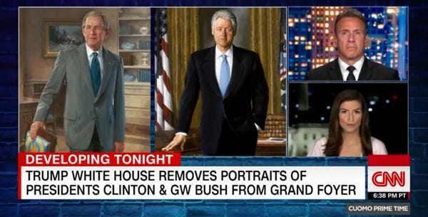 During his Mount Rushmore address over Fourth of July weekend, Donald Trump denounced a "merciless campaign to wipe out our history, defame our heroes, erase our values and indoctrinate our children." This entirely made-up threat must've sounded like fun to him, because he's gotten in on the action. CNN reports that Trump has removed the official portraits of former Presidents Bill Clinton and George W. Bush from the Grand Foyer of the White House sometime over the past week.