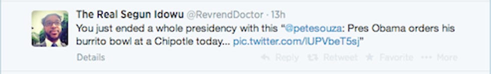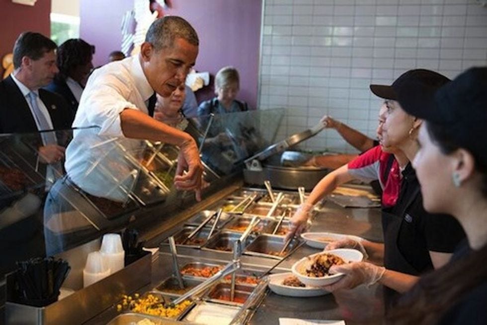 But now? Now? Now that Obama REACHED OVER THE SNEEZE GUARD at Chipotle, like rules and common decency and typhoid don't apply to him? Yeah, now the white libs are pissed .