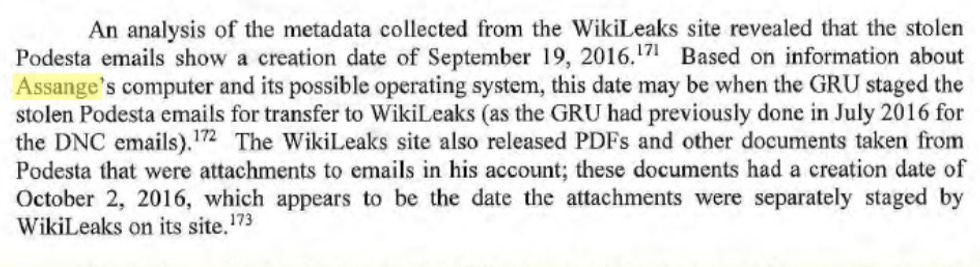 As we all know, the second big document dump from WikiLeaks was Clinton campaign chair John Podesta's emails, and it started on October 7, 2016, on the same day the Obama administration publicly accused Russia of interfering in the election, and also the same day as Trump's "GRAB THEM BY THE PUSSY" tape came out. But as CNN notes, the Mueller Report has an idea of when WikiLeaks got that tranche of documents (Vol. 1, p. 47):
